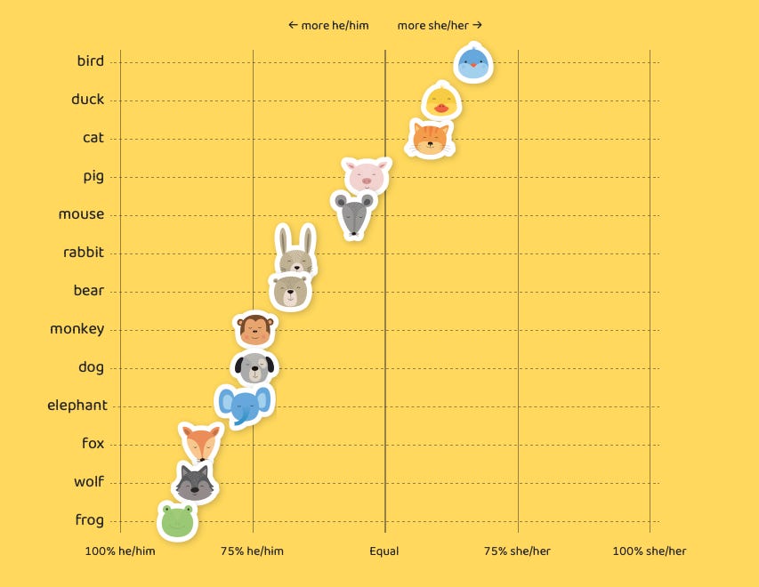 “Bears Will Be Boys” by Melanie Walsh in The Pudding. The Elephant and Piggie books by Mo Willems have always been a huge hit in our house, and continue to deliver great value as my son transforms from listener to reader. I Will Surprise My Friend, our current favourite, confirmed a suspicion I’d had for a while: Gerald (the elephant) is a boy, and Piggie (the pig) is a girl. It’s not just me who thinks this; this “data analysis of animal gender in children’s books” backs it up.