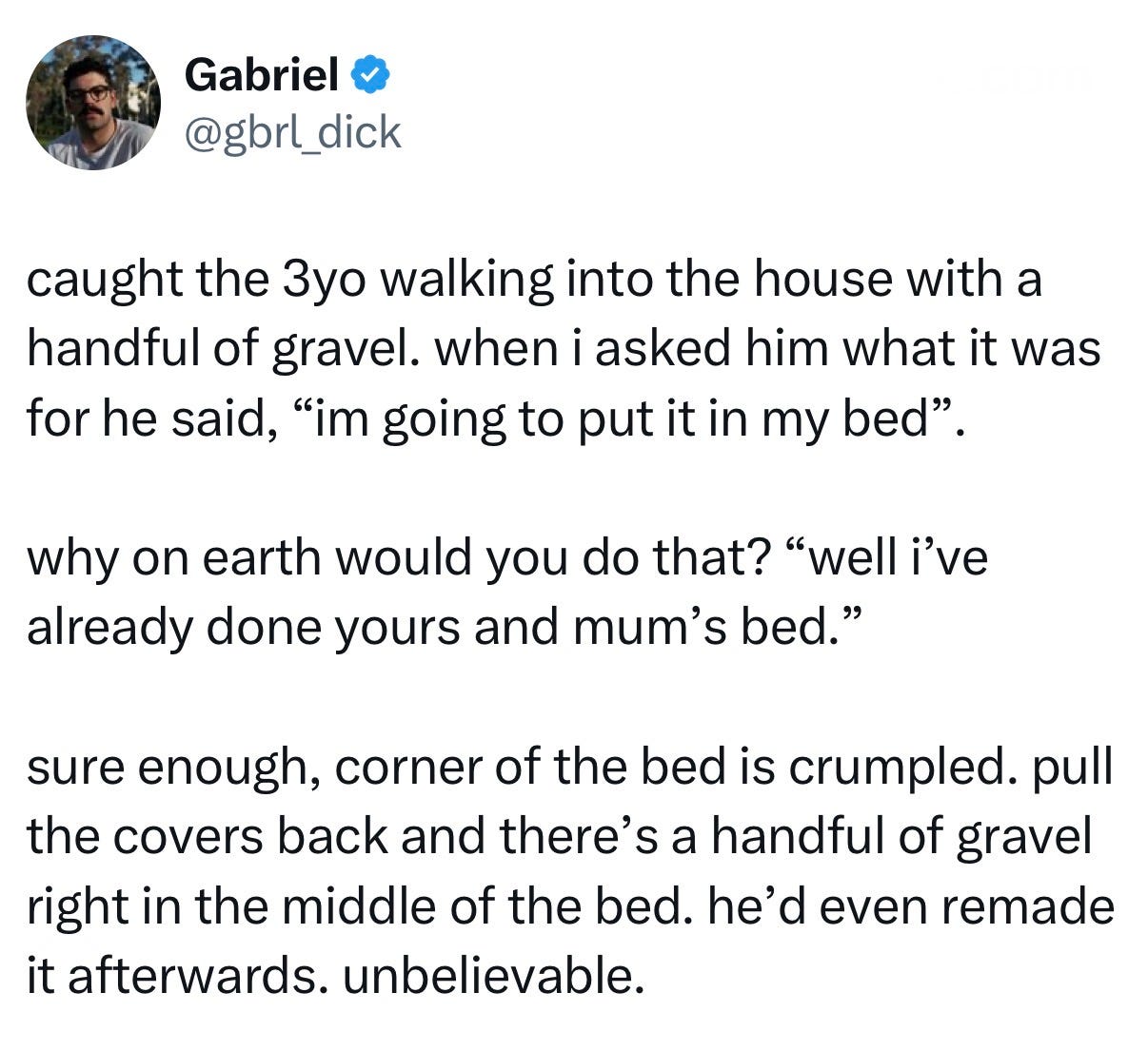One thought your piece stirred is how many of your rules are really about staying oriented to what’s already working. Keeping the water bottle full, not trying to make a happy kid happier, defaulting to the one who cares more—these aren’t optimization strategies so much as ways of resisting unnecessary disruption. I wonder if one of the quiet skills fatherhood teaches is discernment: learning when to intervene, and when presence alone is the most competent thing you can offer.