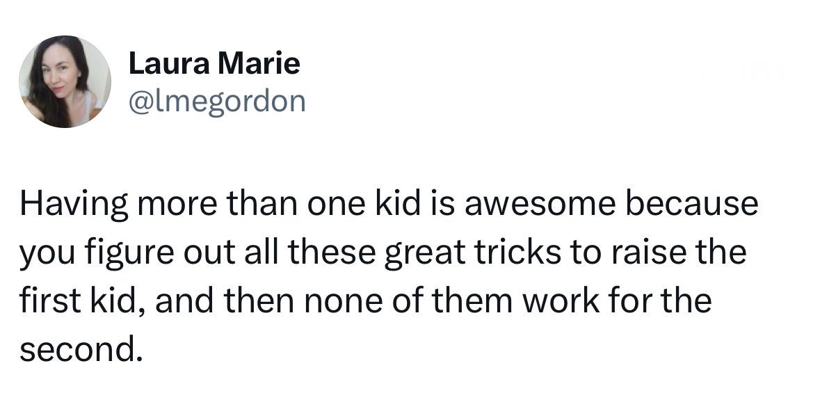 A second child is hard work, and the impact it will have on your life is momentous—dealing with the fallout of my second broke me, but I’m happier than ever with the person that I put back together. Nothing, especially not a 3,000-word essay in a weekly newsletter, will prepare you for the trials a second will throw at you. But through it all, I haven’t regretted it for a moment. My son is one of the funniest human beings I have ever met, and he brings unbridled joy to our lives (almost) every day.