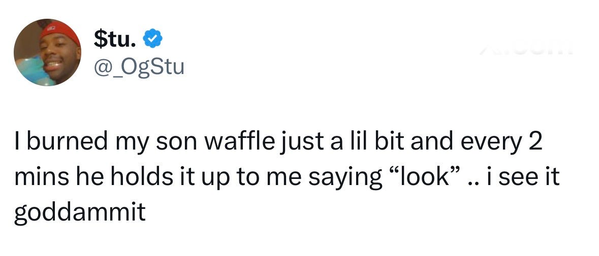 This is another regular update from The New Fatherhood, your parenting public service broadcaster. If this essay played a significant role in deinfluencing you from having another baby, please consider allocating a portion of the $12,980 you will now save every year to an annual subscription.